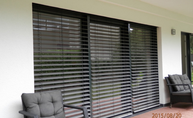 Hier wurde die Brüstung einer Tür-, Fensterkombination ausgebrochen und durch ein dreiteiliges, bodentiefes Fensterelement ersetzt. Mittig wurde eine Parallel-, Schiebe-, Kipptür verwendet. In den vorhandenen Rollladenkasten wurden die neuen dreiteiligen Kompaktjalousien eingepasst. Jeder einzelne Jalousiebehang lässt sich separat steuern. Durch die Verwendung des vorhanden Rolladenkastens wurden keine zusätzlichen Ausbrucharbeiten notwendig und die gesamte vorhandene Fensterhöhe konnte vollständig genutzt werden.